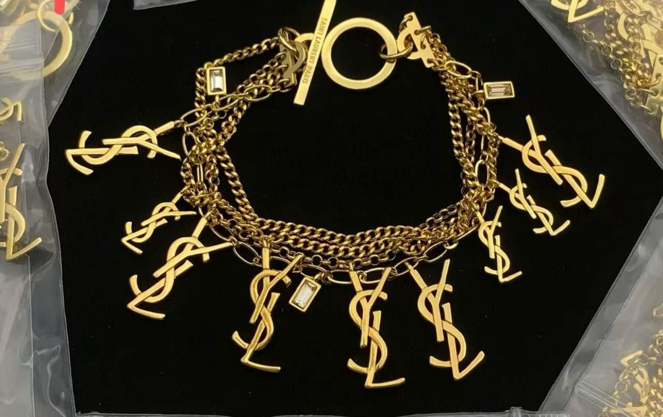 Make a bold statement with this luxurious gold tone multi chain charm bracelet. It features a substantial multi strand chain design adorned with numerous abstract script charms that dangle elegantly. The shiny, high-quality finish makes this piece an eye catching accessory, perfect for adding a touch of glamour and designer-inspired flair to any outfit.